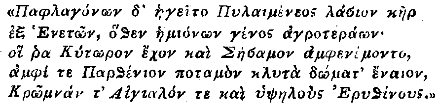Область, называемая Пафлагонскою, населена, сколько древним, столько же и презренным, народом, обвиняемым в бесстыдстве и злонравии. Уже Гомер упоминает о нем в росписи судов, прибывших на помощь Прияму к Трое, говоря следующее: