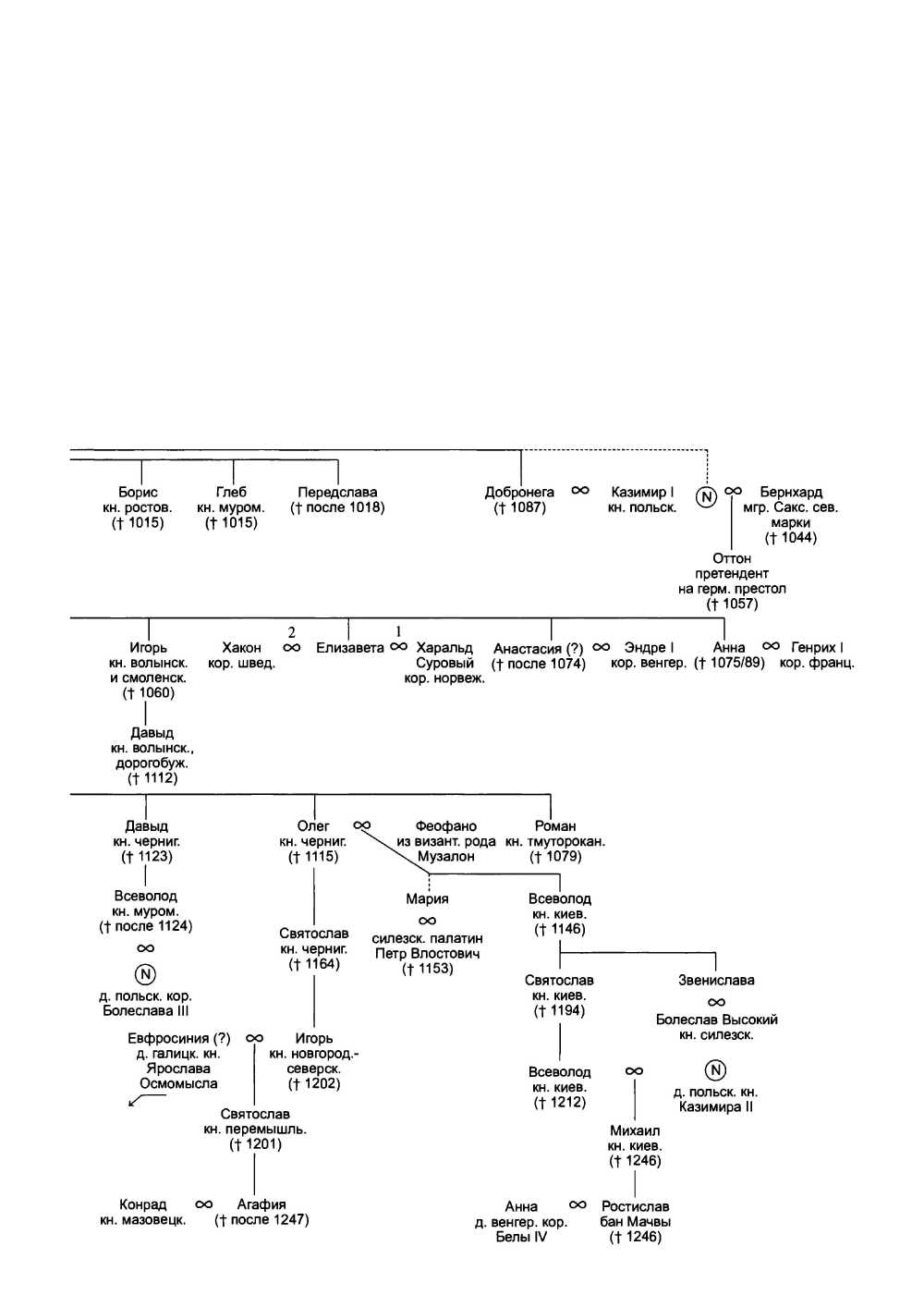 В легенде мы старались, насколько то было нам доступно, учесть актуальный статус названного лица. Иными словами, в таблице VII, где Владимир Мономах фигурирует только как супруг Гиды, он назван князем переяславским, потому что при жизни Гиды Владимир киевским князем еще не был. Но в таблице IXb Мономах обозначен, естественно, как князь киевский.