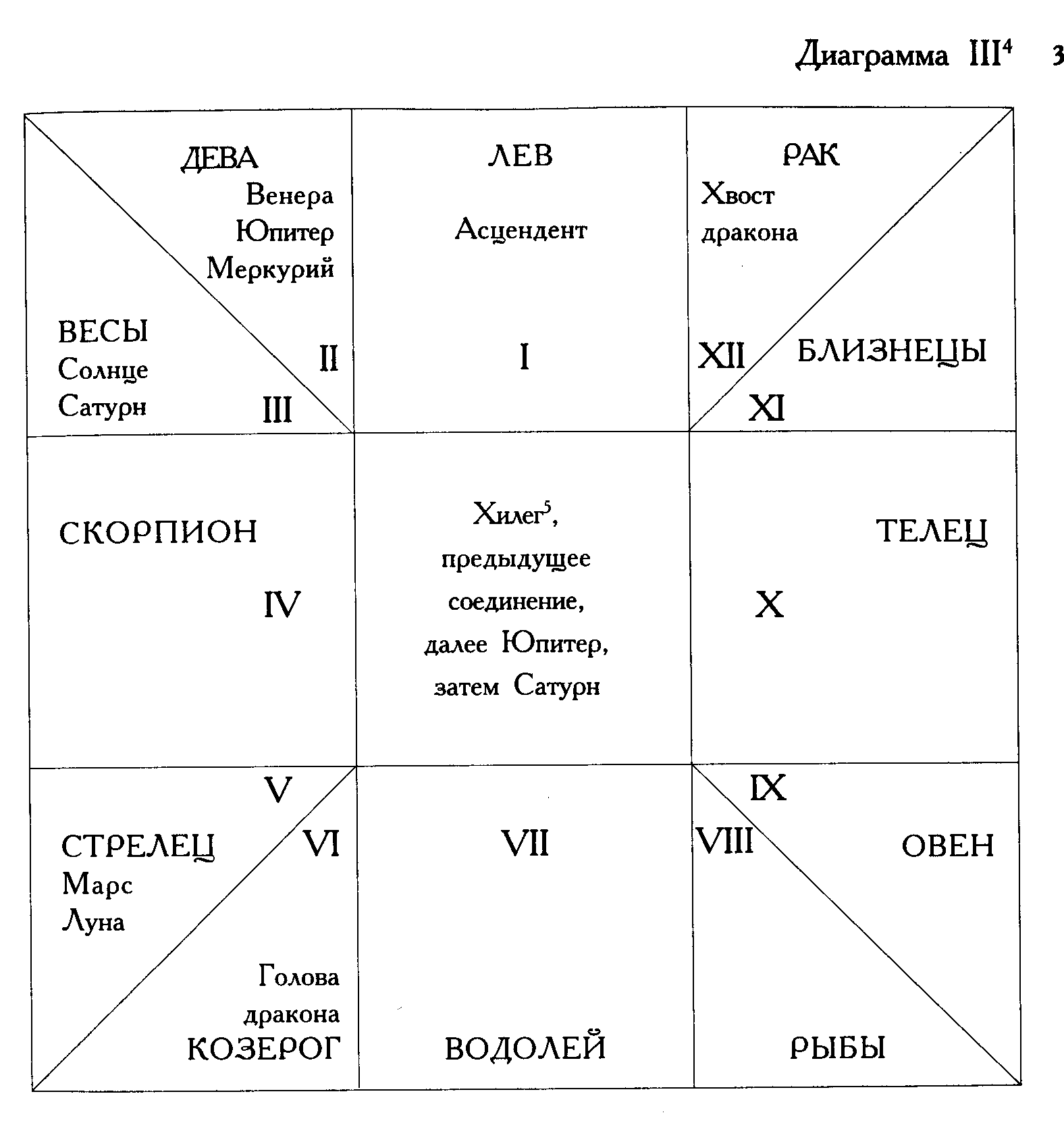 Диаграмма III 4 |32| Хилег 5, предыдущее соединение, далее Юпитер, затем Сатурн.