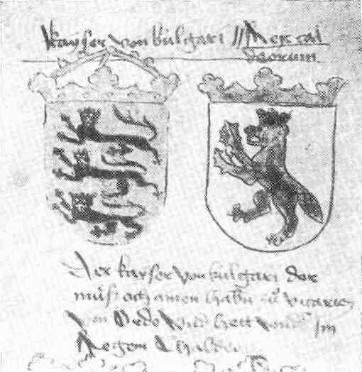 Впервые изображение герба Болгарии появилось в рукописном немецком гербовнике Конрада Грюненберга Allgemeines Wappenbuch в 1483 г. 1. X. Дерменджиев дает подробное описание этого древнего герба болгарских царей — три бегущих золотых льва на коричневом фоне в испанском щите, с золотой короной над щитом и надписью на немецком языке «Der Kajser von Bulgarien». «Это единственный известный до настоящего времени болгарский герб, в котором вместо одного в щите изображены три льва»,— пишет болгарский историк 2. Сопоставляя ряд исторических фактов, X. Дерменджиев высказывает гипотезу, что прототип герба другого типа — с одним львом в щите (из Дубровницкого законника, 1746 г.) следует искать в конце XIV — начале XV в. и что он связан с именем последнего болгарского царя из рода тырновских Шишмановичей — Фружина 3. «Из всего этого следует,— осторожно заключает X. Дерменджиев,— что отнесение этого герба к Болгарии вообще не должно быть безусловным, так как герб мог принадлежать и Видинскому царству. Это вопрос, который еще необходимо всесторонне изучить прежде, чем будет дан окончательный ответ» 4.