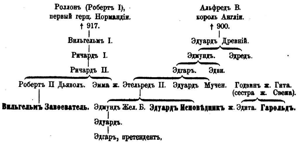 1. Эдуард Исповедник был сын изгнанного датчанами Этельреда II и Эммы, сестры Роберта, герцога Нормандия, следов. тетки Вильгельма Завоевателя. Boт таблица объясняющая родство домов Вильгельма, Эдуарда Исповедника и Гарольда: