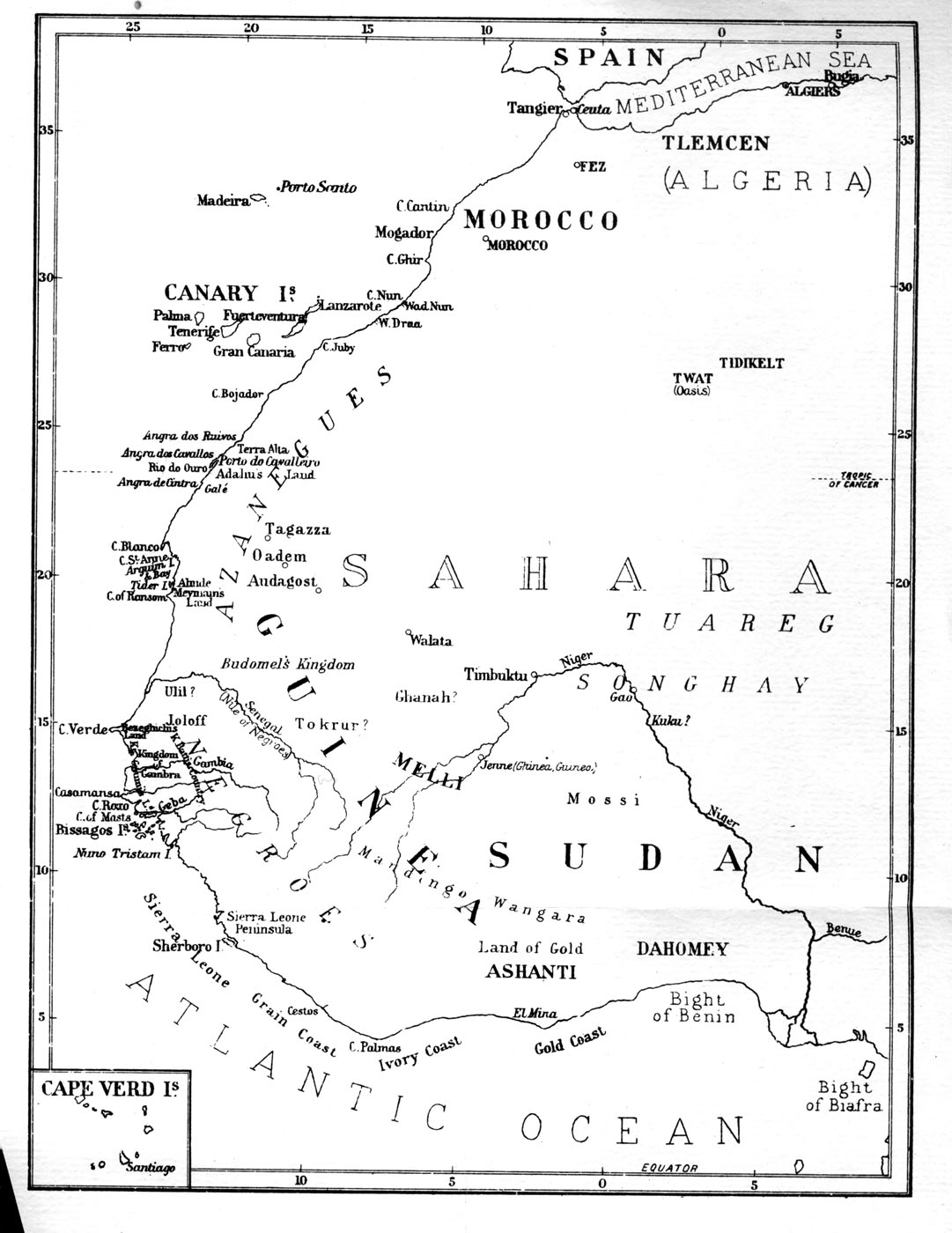 Карта западноафриканского побережья. (200 кб). (Приведены по изданию: Gomes Eannes de Azurara. The Chronicle of the Discovery and Conquest of Guinea. New York. 1964)