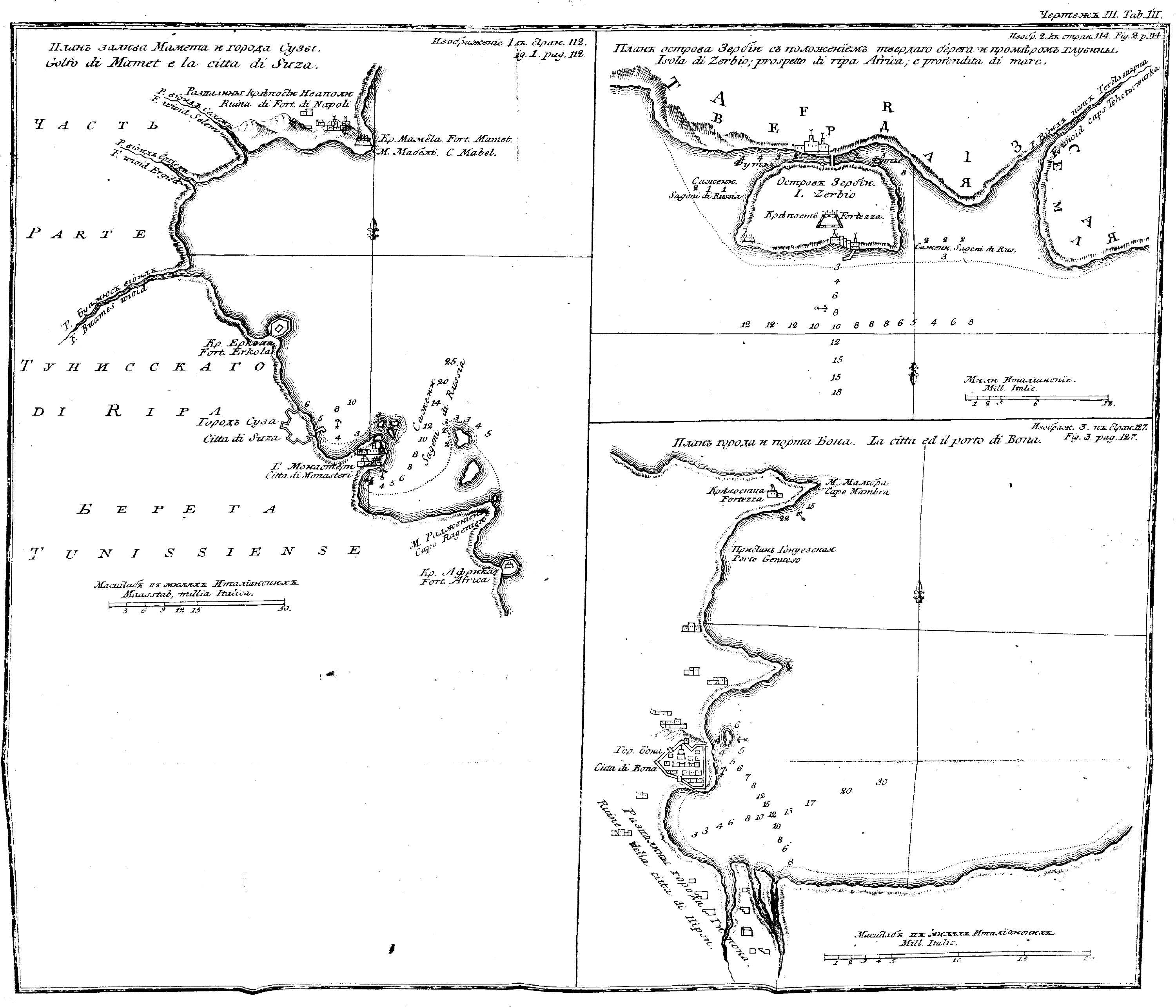 План залива Мамета и города Сузы; острова Зербы; города и порта Бона.