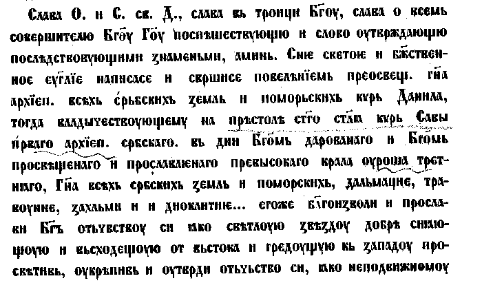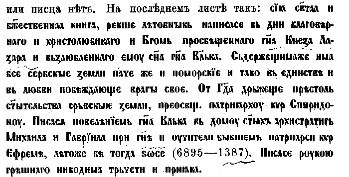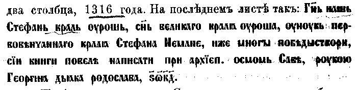 1. Евангелие перг., писанное в 6846 г. (1356). На последнем листе ее замечено: г. 6864 престависе превысокы гндь царь сербски, снь стго крали-а оуроша, гднь Стефан доушана, и-емоуже боудет вечнаи-а паметь.