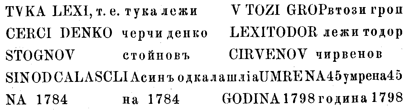 Надписи. С обозрением церквей соединял я всегда исследование памятников вообще. Количество их весьма большое в Македонии, уменьшается в Фракии и почти исчезает в подунайской Болгарии (Мисии). Камней с надписями видел я много в Солуне, Водене, Битоле, Охриде, Ресне и Серресе. В доспатских горах, близ Рила, и на юг от Ихтимана в ущелии по одной, Филиппополе три, в Тернове нашел одну надпись, но списать их не мог. Все [151] эти памятники, за исключением приведенных выше славянских, греческие, и принадлежат македонской и римской эпохам. Лишним почитаю приводить скопированные мною надписи, потому что они большею частию известны уже из ученых путешествий Лика и Кузинера, и они ничто иное как эпитафии частных лиц или мемории храбрых воинов и заслуженных граждан. Но нельзя здесь не упомянуть об одной надписи, которая имеет связь с лексикальным объяснением слова мома, употребляемого ныне в болгарском языке. Камень с этою надписью находится в селе Бела-церква, что в прилепском поле. Он вделан в церковную стену извне с тремя другими. На нем большими буквами начертано: