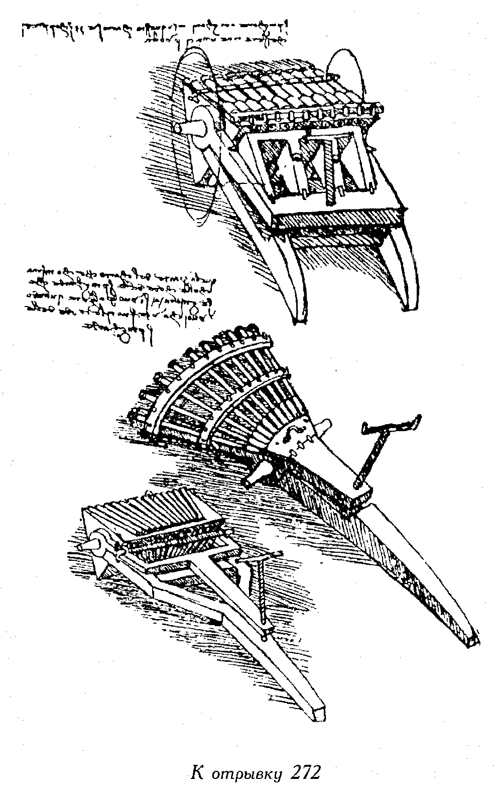 - (Леонардо почти всегда прилагает к частям своего аэроплана наименование частей птицы, а самый аэроплан часто называет птицей. Так и в этом отрывке он говорит о связках и сухожилиях аэроплана)
