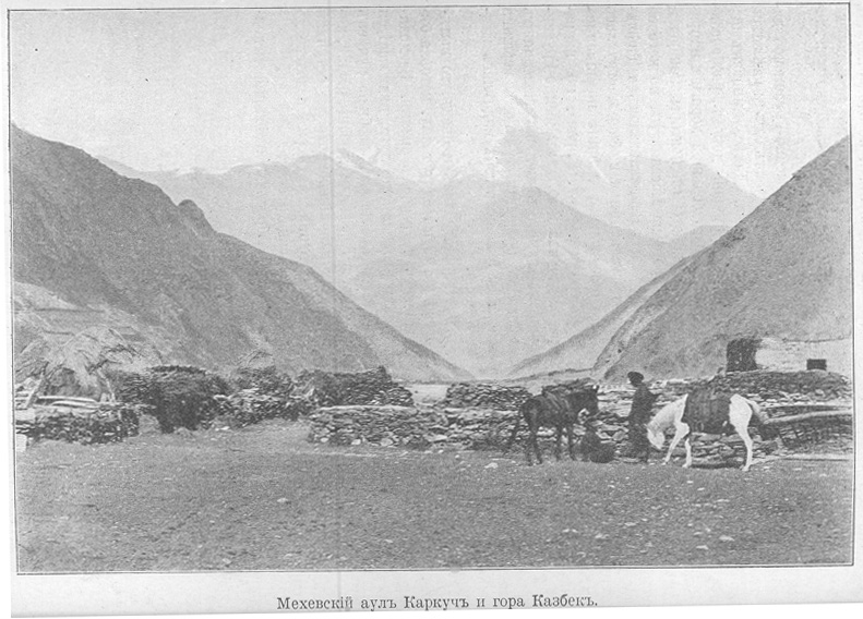 Мехевский аул Каркуч и гора Казбек. (163 кб).