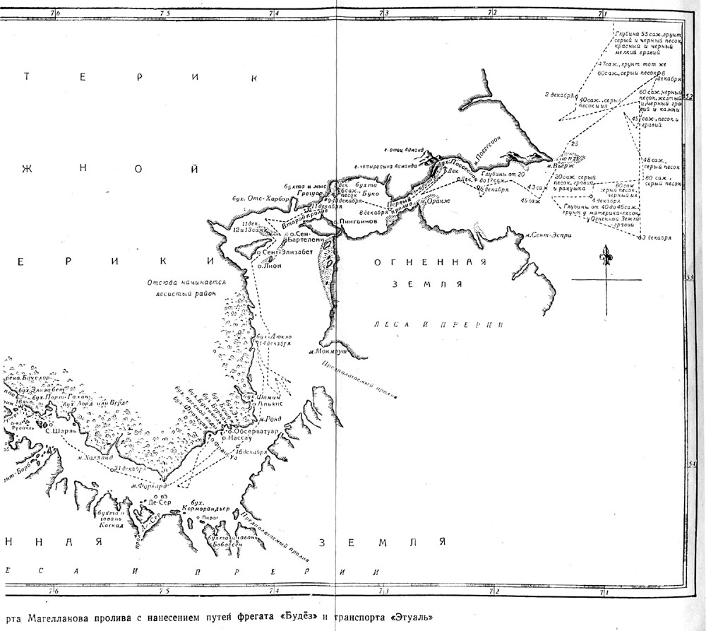 Карта Магелланова пролива с нанесением пути фр. кораблей "Будез" и "Этуаль". (149 кб).