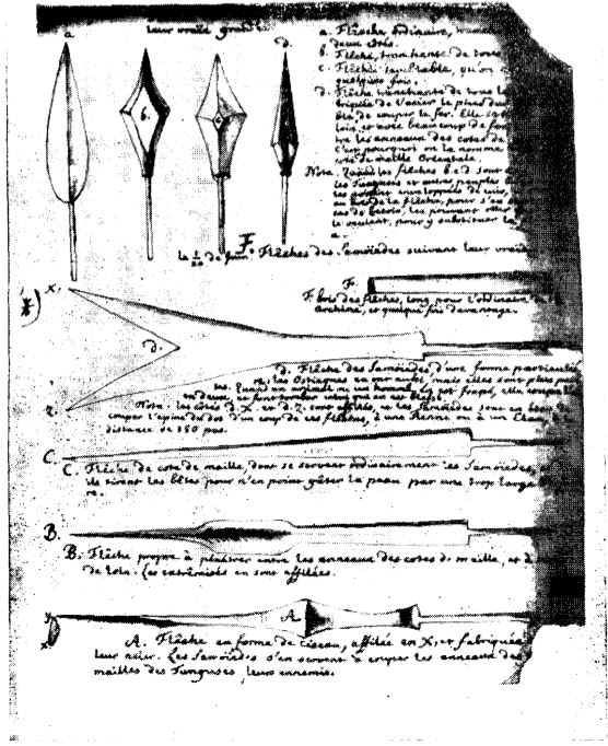 такая же стрела, иногда отравленная; d — стрела с наконечником, заостренным со всех сторон, сделанным из самой твердой стали (им можно резать железо). Стрелу с таким наконечником пускают с очень большого расстояния; она пробивает кольчугу и поэтому называется «стрелой для восточной кольчуги». Отравленные наконечники стрел типа b, с и d эвенки и другие народы носят завернутыми в кожух. Ниже изображены стрелы ненцев также «соответственно их истинному размеру»: «F — древко стрелы обычно длиной 1,5 аршина, а то и больше; d — стрела ненцев особой формы; ханты имеют такие же (отмечено знаком *), но меньших размеров. Когда такие стрелы попадают в животное или человека, они разрезают кость надвое. Стороны наконечника— dx и dz — заострены и способны рассечь позвоночник оленя или лося одним ударом- на расстоянии 150 шагов. С — стрела, которой ненцы обычно пользуются при охоте на животных, чтобы не портить [98] шкуру слишком широкой раной. В — стрела, способная проникнуть между колечками кольчуги. Ею можно стрелять издалека, концы ее наконечника сильно заострены. А — стрела в форме долота, наконечник, заостренный со стороны х, изготовлен из лучшей стали. Ненцы пользуются такими стрелами, чтобы срезать колечки кольчуги эвенков, своих врагов».