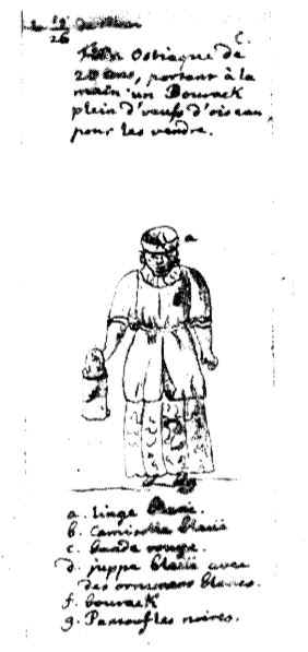 Интересно сообщение Кенигсфельда об одежде хантов. Чаще всего они шили ее из рыбьей кожи, причем чешую не счищали (pannitiy-sog). Женщины окрашивали свой костюм в огненно-желтый или красный цвет при помощи сока растений. Зимой и летом женщины и мужчины носили также одежду из шкур выдры. Однако, сообщал Кенигсфельд, ханты все чаще начинают одеваться на русский манер и шить одежду из полотна, китайки и других тканей. На рис. 2 изображена остяцкая девушка 20 лет, которая несет для продажи бурак (по местному туес) с яйцами. На девушке голубая кофта, подпоясанная красной лентой, и голубая юбка с белым рисунком; на голове у нее белая полотняная повязка, на ногах — черные туфли.