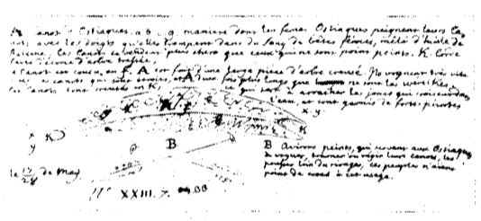 Кроме маленьких лодок, у хантов были еще «дорогие» лодки, очень узкие и в два раза длиннее, чем верейки, одна из них изображена на рис. 4. Каждая сторона лодки сделана из выдолбленного дерева (А) и украшена рисунком (а, b, с, d), который женщины наносили пальцами, обмакивая их в кровь диких зверей, смешанную с китовым жиром. Лодка сшивная. На рисунке показаны шов — f и К — канат, сплетенный из лыка. Лодка имеет вырезы на бортах (к) с сильно заостренными концами (х, у), помогавшие ей проходить в местах, заросших тростником. Гребли в такой лодке двумя разрисованными веслами (В), которые служили также для управления лодкой и для отталкивания от берега. На суше ханты перевозили лодку с помощью двух собак.