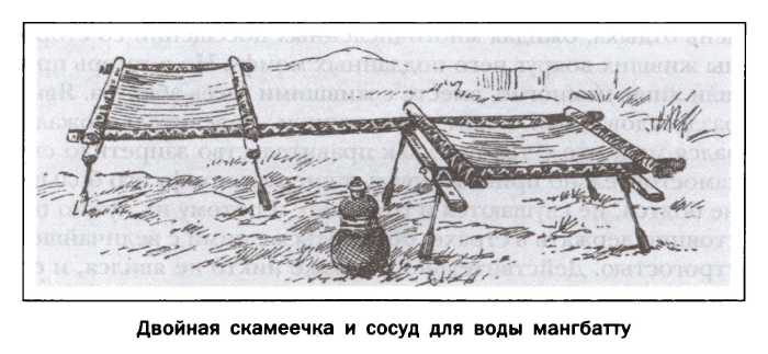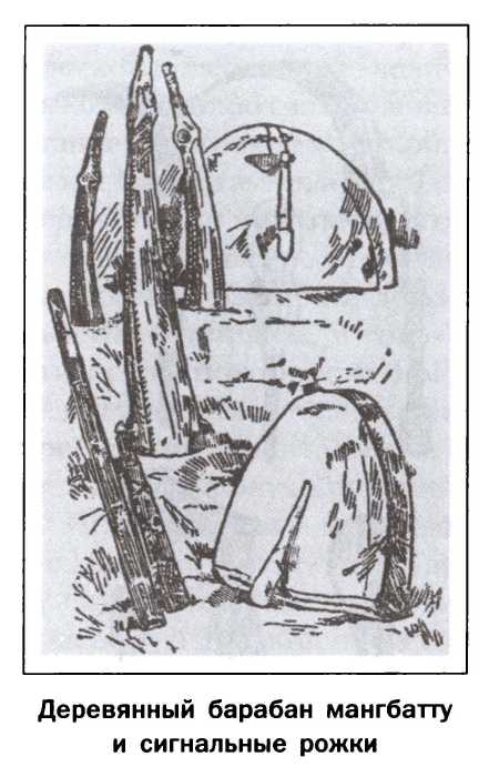 Деревянный барабан мангбатту и сигнальные рожки