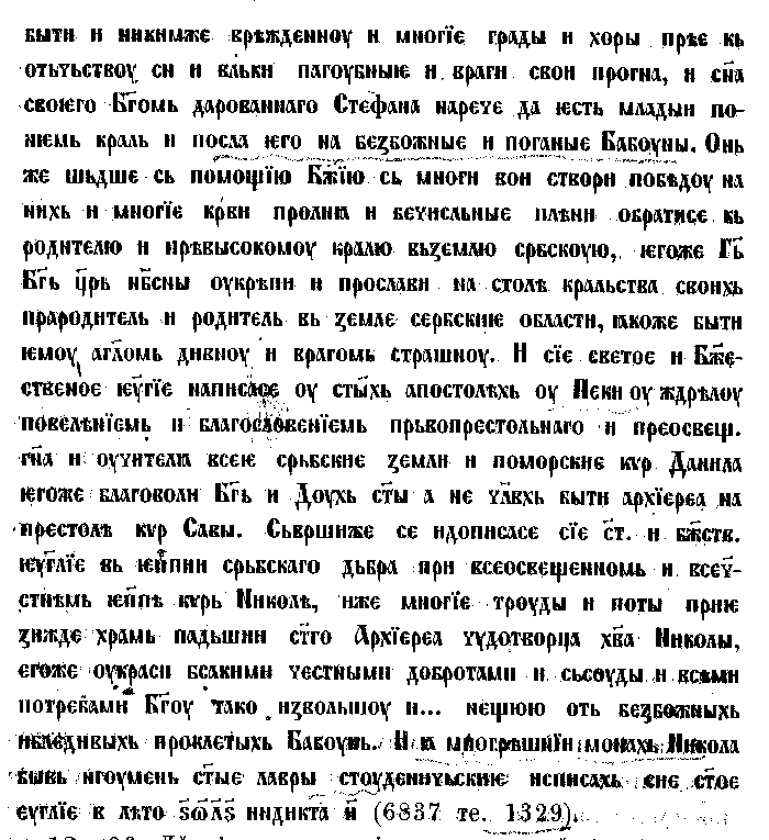 1. Евангелие перг., писанное в 6846 г. (1356). На последнем листе ее замечено: г. 6864 престависе превысокы гндь царь сербски, снь стго крали-а оуроша, гднь Стефан доушана, и-емоуже боудет вечнаи-а паметь.