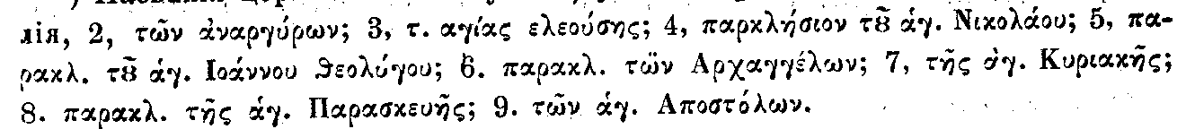 Особенное внимание обращал я на церкви в том предположении, что найду указание на что нибудь славянское. Кроме сказания о Кирилле и Мефодии, в жизни св. Саввы сербского упоминается славянский монастырь Филаколи, сооруженный в Солуне, иждивением сербских кралей. Из 20 монастырей, существовавших здесь до вторжения Турков, сохранился лишь один, называемый прежде twn blattewn, теперь обыкновенно, Чауш — монастырь. О прочих обителях потерялась и память даже. Заметны однакож при трех церквах следы Монастырских оград. Вообще [89] в Солуне теперь 13 больших церквей и 7 малых. Эти последние большею частию зависят от первых. Представляю имена их: церкви: 1, митрополия во имя св. великом. Дмитрия и Григория Паламы; 2, св. Николая thV politeiaV; 3, Рождества Богородицы, назыв. panagouda; 4, Сретения; 5, св. Константина и Елены, 6, Богородицы, назыв. panagia dexa и св. Ипатия; 7, Успения Б. м.; 8, св. Феодоры; 9, св. Мины; 10, Животворящего источника или Богородицы laogodhanhV; 11, Преображения в монастыре Чауш; 12, св. Николая twn arcontwn; 13, св. Афанасия. Параклисы или малые церкви: 1, св. Харлампия; 2, св. Антония; 3, Богородицы thV eleousiV; 4, св. Николая tou orjanou; 5, св. великомуч. Георгия; 6, cв. Николая; 7, Богородицы, называемой persiotza. Во всех этих и особенно в параклисах видел я много весьма ветхих икон и несколько церковных древностей, но не нашел ни следа памяти о славянских апостолах, по сказанию, уроженцев солунских. В одном лишь монастыре Чауше недавно поставлена икона св. Наума славянского, но и она нова.