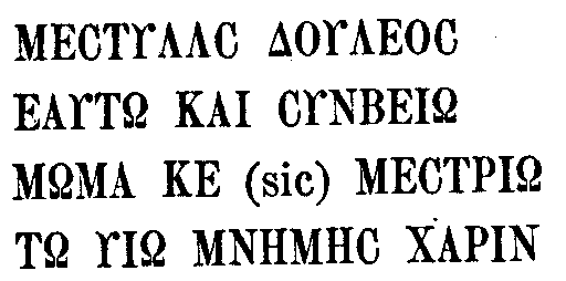 Надписи. С обозрением церквей соединял я всегда исследование памятников вообще. Количество их весьма большое в Македонии, уменьшается в Фракии и почти исчезает в подунайской Болгарии (Мисии). Камней с надписями видел я много в Солуне, Водене, Битоле, Охриде, Ресне и Серресе. В доспатских горах, близ Рила, и на юг от Ихтимана в ущелии по одной, Филиппополе три, в Тернове нашел одну надпись, но списать их не мог. Все [151] эти памятники, за исключением приведенных выше славянских, греческие, и принадлежат македонской и римской эпохам. Лишним почитаю приводить скопированные мною надписи, потому что они большею частию известны уже из ученых путешествий Лика и Кузинера, и они ничто иное как эпитафии частных лиц или мемории храбрых воинов и заслуженных граждан. Но нельзя здесь не упомянуть об одной надписи, которая имеет связь с лексикальным объяснением слова мома, употребляемого ныне в болгарском языке. Камень с этою надписью находится в селе Бела-церква, что в прилепском поле. Он вделан в церковную стену извне с тремя другими. На нем большими буквами начертано: