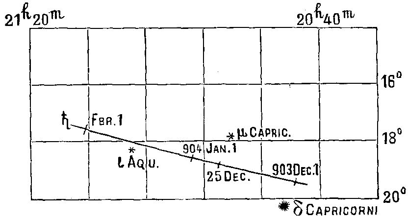 Из этих прохождений только среднее (1080-1082) следует принять во внимание, при коем h в середине декабря 1080 г. находится вблизи ι Aquarii. – В начале 1080 г. он был приблизительно на обозначенном х месте. |