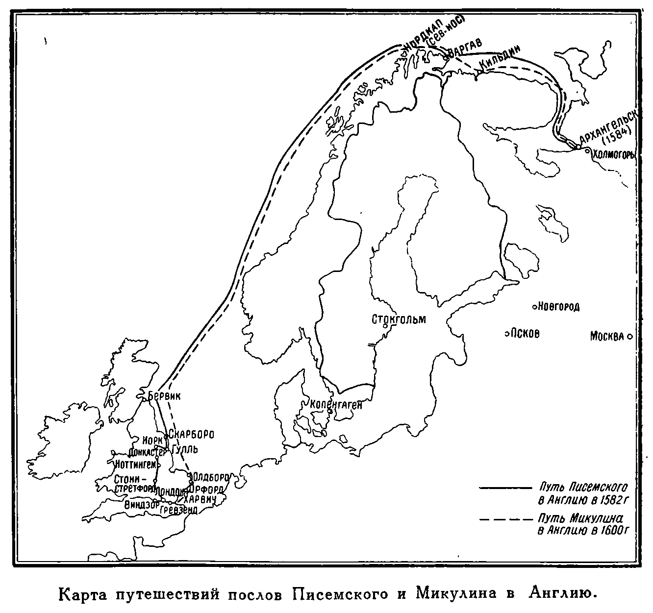 Карта путешествий послов Писемского и Микулина в Англию