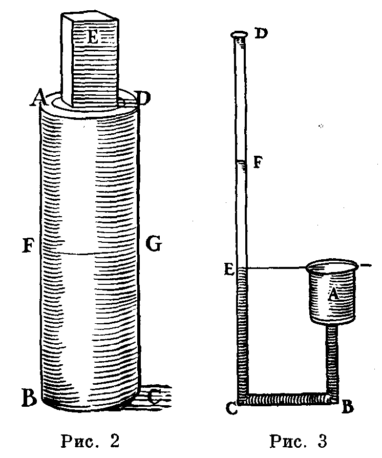 Мы сделали много стеклянных сосудов, подобных тем, которые изображены здесь и обозначены буквами А и В, — широкие, с шейкой длиною в два локтя 6. Когда они были наполнены ртутью, а затем отверстие закрывалось пальцем и сосуды эти погружались в сосуд С, где находилась ртуть, можно было видеть, что они становились пустыми и ничего не поступало в опустошающийся сосуд; однако шейка AD оставалась всегда наполненной до высоты l 1/4 локтя и еще одного пальца. Дабы показать, что сосуд был совершенно пустым, нижняя чашка наполнялась водой до D, и если сосуд постепенно поднимали, можно было видеть, что когда отверстие сосуда достигало воды, ртуть опускалась из шейки, а вода целиком наполняла сосуд со страшным напором (con irnpeto horribile) вплоть до знака Е. Пока сосуд АЕ был пустым и ртуть, хотя и обладающая большой тяжестью, продолжала держаться в шейке АС, мы рассуждали так: до сих пор существовало мнение, будто сила, не позволяющая ртути, вопреки ее природному свойству, падать вниз, находится внутри сосуда АЕ, т.е. заключается либо в пустоте, либо в веществе, предельно разреженном; однако я утверждаю, что эта сила — внешняя и что сила берется извне. На поверхность жидкости, находящейся в чашке, действуют своей тяжестью 50 миль воздуха. Что же удивительного, если ртуть, не имея ни стремления, ни отвращения находиться в стеклянном сосуде СЕ, проникает туда и поднимается настолько, чтобы уравновесить тяжесть наружного воздуха, который ее гонит.
