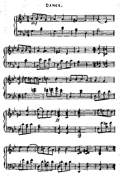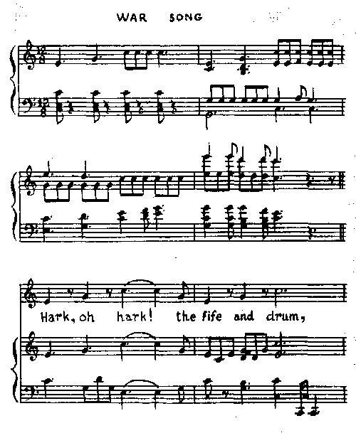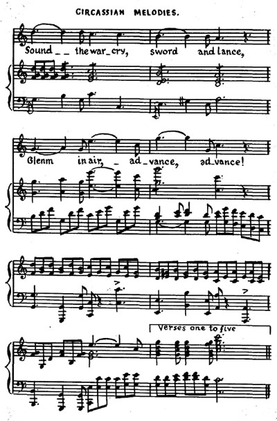 Я получил удовольствие от свежести черкесских мелодий; и музыка, если сравнить ее с татарской или турецкой, является достаточно гармоничной. Их ка-ри-ра, песня лодочников, исполняемая всем населением, является восхитительной; также марш, исполняемый на свирели; но их самыми любимыми являются военные, песни, обычно исполняемые хором во время похода, когда леса и горы отражают маршевую мелодию, и энтузиазм народа возбуждается до степени, какую можно найти только в восточной стране. Их песни обычно связаны с победами, одержанными и над казаками или над ненавистной Москвой, или являются выражением воодушевленного призыва к битве. Но, так как описание их может слабо донести только идею произведения, я приведу несколько самых популярных мелодий для вашего увеселения.