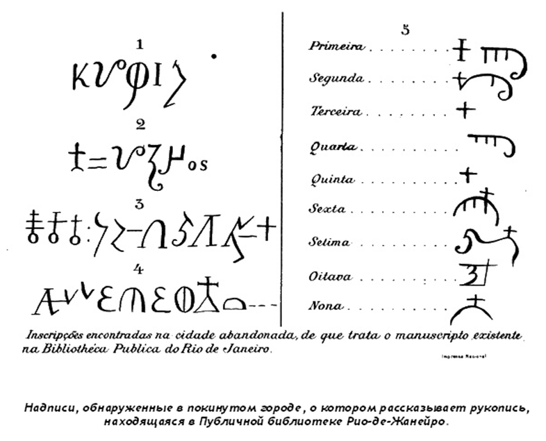 Между этими пещерами (furnas) мы увидели одну, закрытую большою каменною плитою, и со следующими рисунками, вырезанными в том же камне, кои намекают на великую тайну, как представляется (см. отт. надп. № 2). На портике храма мы видели иные знаки, следующей формы, нижеприведенные (надп. № 3).