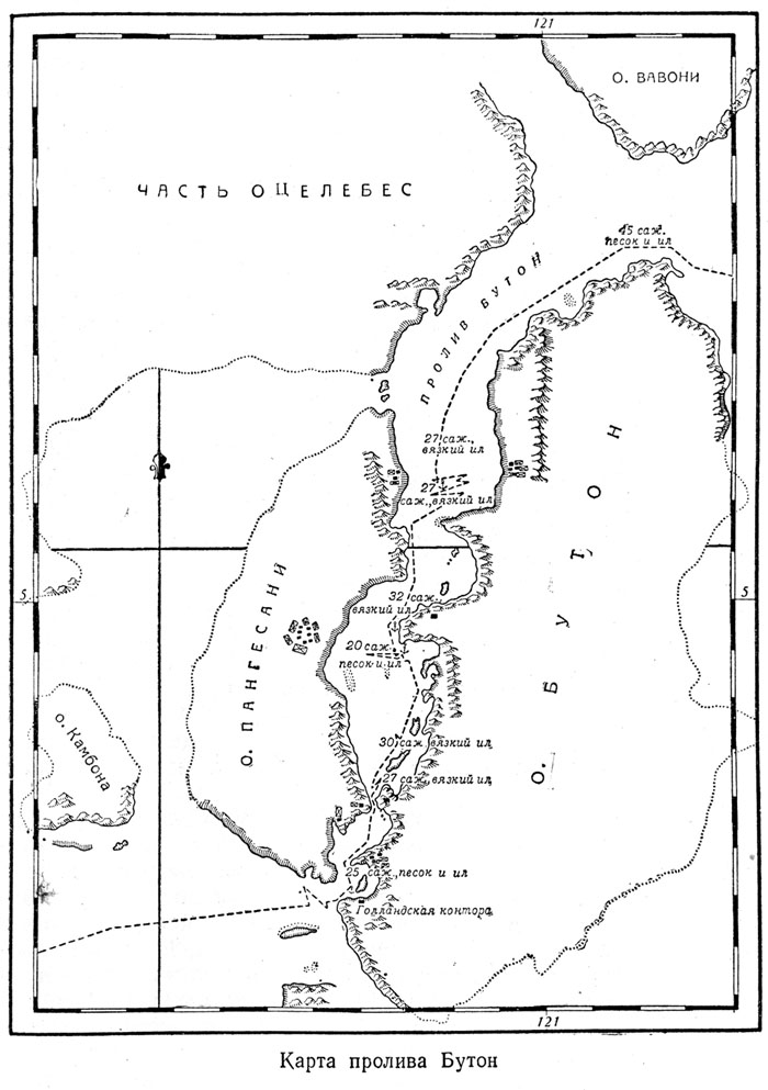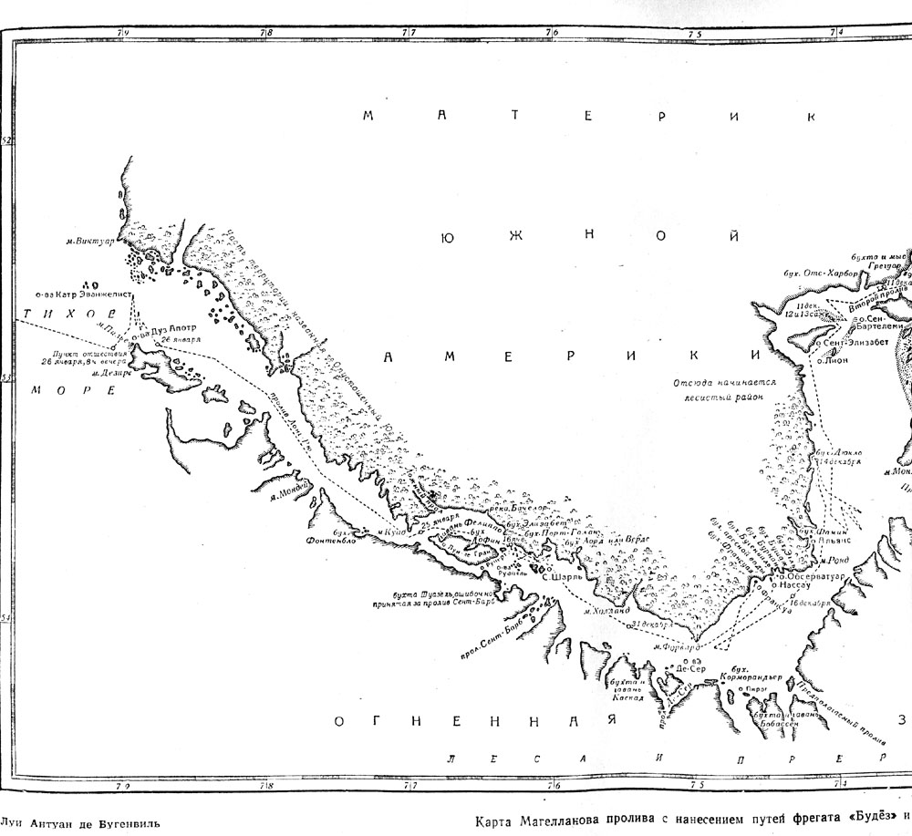 Карта Магелланова пролива с нанесением пути фр. кораблей "Будез" и "Этуаль". (149 кб).
