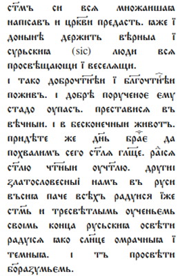 словесами украсив. А также молитвы... похвалы многим святым создав, передал их церкви, так что доселе пользуются ими благоверные и [?]люди,всех просвещая в радости... Так доброчестно и благочестиво прожив, порученное ему стадо успешно окормляя, преставился в вечный... в бесконечную жизнь. Придите же днесь, братия, да восхвалим святителя этого, говоря: «Радуйся, святитель, славны учитель, други... златословесный воссиял нам в Руси выше всех; радуйся тем, что святым и тресветлым учением своим осветил все концы русские; радуйся, что, как солнце, помраченных и темных ты просветил постижением Бога. |