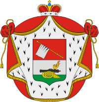 Щит разделен на две части. В верхней в красном поле изображено белое знамя, имеющее древко золотое. В нижней части в серебряном поле герб Смоленский, т.е.: на золотом лафете, поставленном на зеленой траве черная пушка с сидящей на оной райской птицей. Щит покрыт мантией и шапкой, принадлежащими княжескому достоинству. Как шапка, так и мантия княжеская присвоены издревле дворянскому роду Татищевых, по тому, что оный происходит от князей смоленских и имеет герб смоленских князей с прибавлением в верхней части знамени. Герб Татищевых внесен в «Общий гербовник дворянских родов Российской империи», часть II, 1-е отд., стр. 17.15