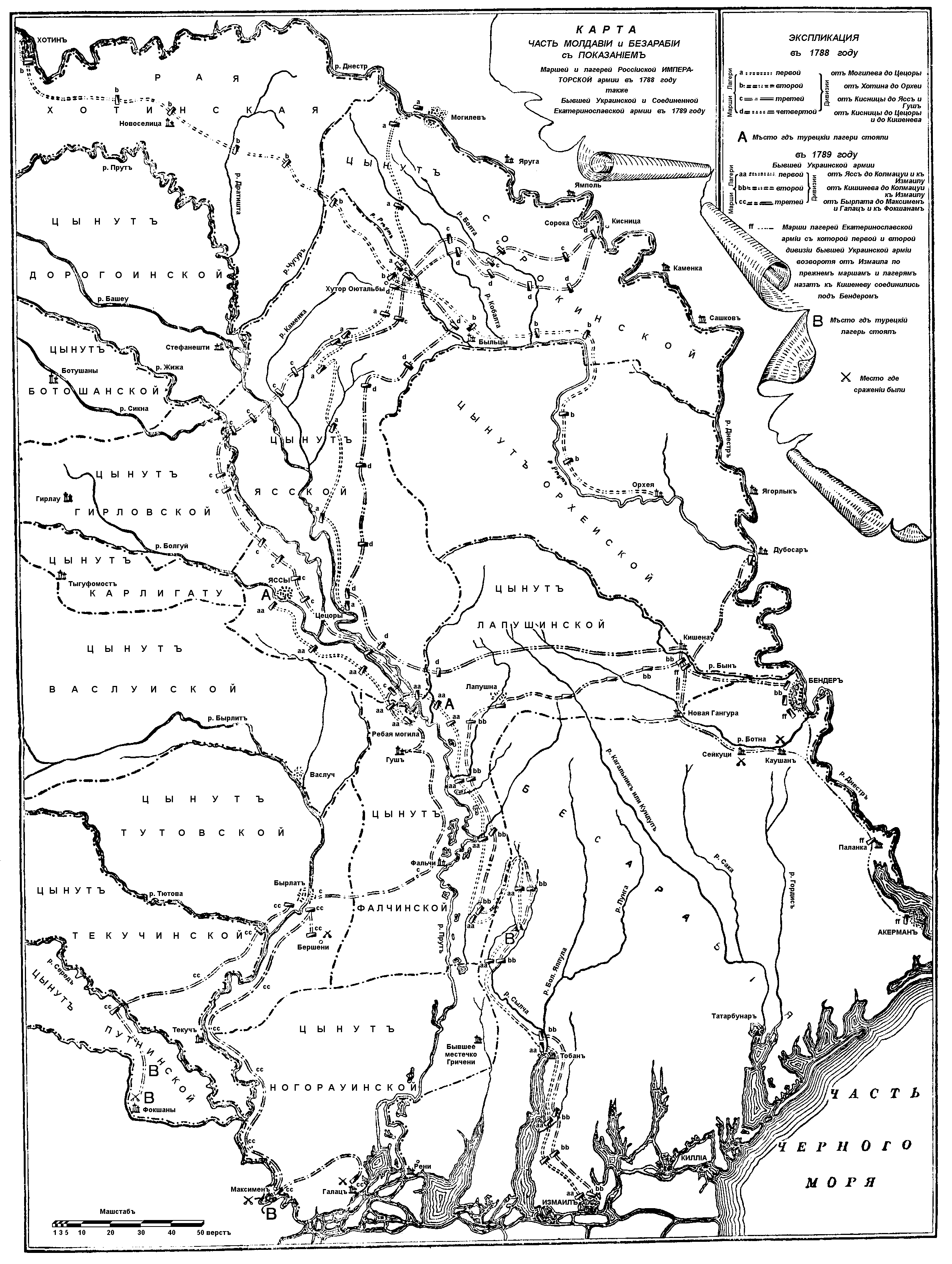 8. Карта, представляющая часть Молдавии и Бессарабии с показанием марша бывшей Украинской армии в 1789 году и расположения войск на винтер-квартиры (по цынутам) соединенной армии. (304 кб.) Описание.