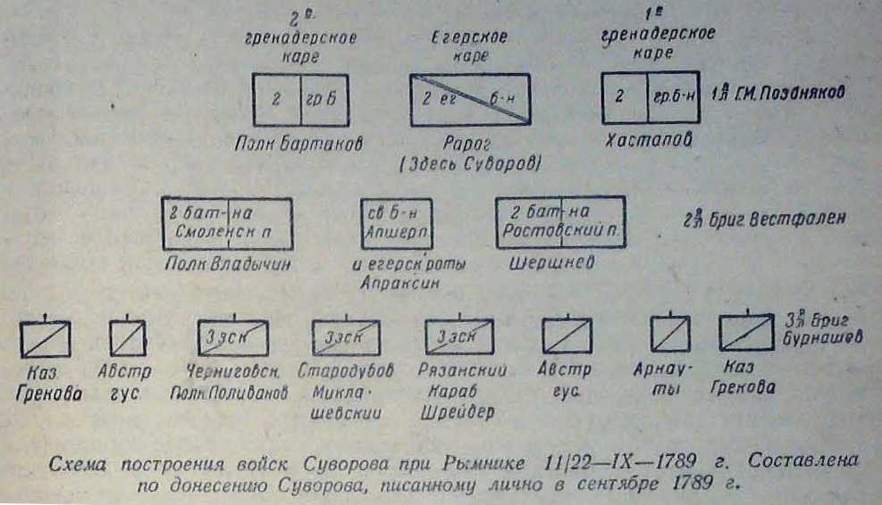 — союзные войска, перейдя р Рымну двумя колоннами, стали в боевой порядок: русские по правую сторону, австрийцы по левую В — русский корпус и несколько австрийских эскадронов качали наступление на первый турецкий лагерь у леса Тыргокуколи; С — бригада ген Карачая, назначенная для связи между обоими корпусами; D — турецкая конница нападает на левый Фланг русских; FF — турецкая конница обретена в бегство перекрестным огнем русского каре и конницы Карачая; G — русские каре и конница Карачая подошли к турецкому лагерю, несмотря на жестокий огонь батареи Н; J — турки отбиты от лагеря и батареи, но скрываются в лесу, а часть отступает к К, преследуемые конницей и 2 каре русских; М — русские егеря выбывают турок из леса Каяту, которые бегут N к лесу Крынгу-Мейлор; О — временная передышка русских войск около высоты; P — нападение турок на австрийские войска; S — новая позиция австрийских войск после турецкой атаки; Q — ретраншемент в Крынгу-Мейлорском лесу, занятый янычарами; R — турецкая конница, прикрывавшая оба крыла; Т — конная атака турок на Карачая, UV — перекрестный огонь австрийских и русских каре, оптразивший турецкую атаку; Y — Суворов направляет русские войска от Л и X в обход турецкой батареи у дер. Бонна; Z — соединенные русские и австрийские войска атакуют турецкий рентраишемент. Русская конница атакует укрепление в конном строю, опрокинув турецкую конницу: Аа — оба корпуса преследуют турок за лес; Вb — русские войска овладевают 3-м турецким лагерем при Мартинешти; Сс — русские войска берут последний 4-й турецкий лагерь за Рымником, оставленный турками ночью.Схема построения войск Суворова при Рымнике