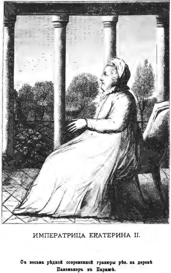 Приложенный к настоящей книжке «Исторического Вестника» портрет императрицы Екатерины II есть точное воспроизведение редчайшей гравюры, находящейся в собрании русских портретов П. Я. Дашкова и приобретенной им от покойнаго собирателя редкостей Иванчина-Писарева. По объяснению последнего, портрет этот гравирован с наброска, сделанного с натуры состоявшим при английском посольстве г. Уейнсом (Waynes) вовремя представления его Екатерине II в Царском Селе.