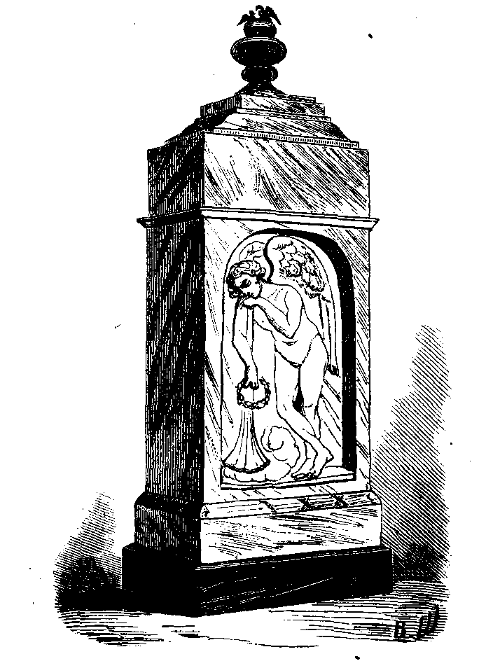 Год кончины великой княгини Александры Павловны 1801 был тяжким, скорбным годом для императрицы Марии Феодоровны. В марте месяце она лишилась супруга (в ночь с 11-го на 12-е число); в последних числах пришло в Россию известие о кончине палатины венгерской; 12-го сентября того же года скончалась вторая дочь императрицы — Елена Павловна, наследная принцесса Мекленбург-Шверинская. Монумент в ее память, также в Павловске, и также трудом ректора Академии Художеств И. П. Мартосом, сооружен в 1810 г., на небольшом полуостровке, близь дворца. На невысоком столбе, составляющем памятник, находится барельеф из белого мрамора, изображающий гения, он опирается на обращенный к низу факел. На другой стороне столба надпись, означающая время кончины великой княгини, а именно: «Сентября 12-го дня 1801 года». Местоположение вокруг обоих памятников весьма живописно.