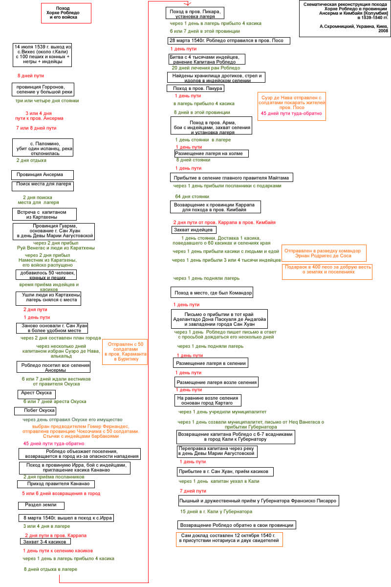 На следующий день сеньор Капитан приказал поднимать лагерь, и пошел туда, где был Командир, и двухдневный переход он прошел за один день, и прибыв в постоялые дворы, где находился Командир, прибыл индеец с письмом, которое ему послал один Капитан, пришедший в город Сан Хуан, где он уведомлял его, что от индейцев стало известно, как он ушёл в провинции Кимбайа, и что они не смогут этого осуществить, поскольку прошло пять месяцев, как он отправился вниз по течению реки через провинции Каррапа; и что если то письмо придет к нему в руки, то он уведомлял его, что в качестве губернатора этой земли пришел аделантадо Д[он] Паскуаль де Андагойа, и он послал его с людьми пешими и конными взять владение над городом Сан Хуан, и он завладел им от имени сеньора губернатора Дона Паскуаля де Андагойа, и дал ему имя - город Сан Хуан, и нёс сеньору Капитану провизию от Капитан-генерала всех городов, чтобы он заселил и завоевал [их]; и что если он захватит тот город, то сразу же напишет ему или придёт повидаться с ним. И увидев письмо, сеньор Капитан утром на следующий день, написал в ответ письмо [и] с тем же индейцем [отправил], и чтобы он подождал его несколько дней, что он скоро прибудет к нему. Индеец, несший его, как потом оказалось, не принёс письмо вышеупомянутому Капитану, пришедшего от сеньора Аделантадо; он [этот капитан] вернулся в город Кали, где находился сеньор Губернатор; и он рассказал ему все, что случилось, и как не появились ни сеньор Капитан Хорхе Робледо, ни его люди, что очень рассердило сеньора Губернатора.