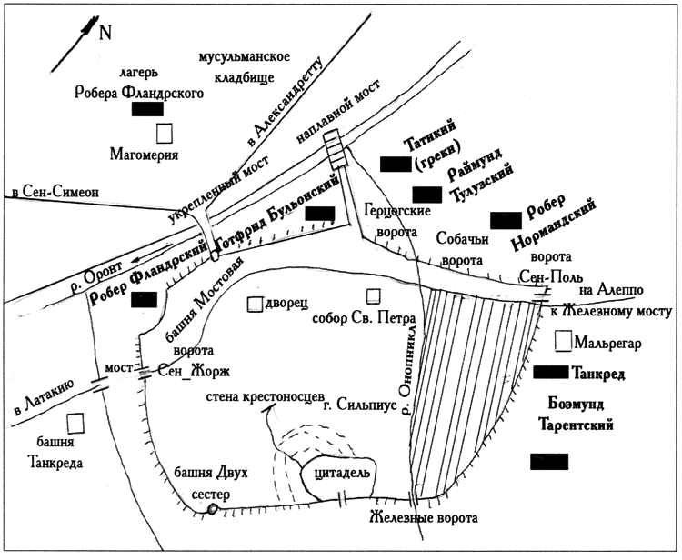 14. Отряды Боэмунда заняли позицию на северо-восточной стороне города у ворот Св. Павла. Далее до Собачьих ворот разбили лагерь воины Роберта Нормандского, Роберта Фландрского, Стефана де Блуа и Гуго Вермандуа. Армия Раймунда Тулузского расположилась к западу от Собачьих ворот, а Готфрида Бульонского - у ворот Дюка неподалёку от моста через Оронт. Цитадель на склоне горы Сильпиус на юге и ворота Св. Георгия на северо-западе не были блокированы крестоносцами — они контролировали только четверть от общего периметра крепостной стены, — благодаря чему на протяжении всей осады в Антиохию свободно поступал провиант.